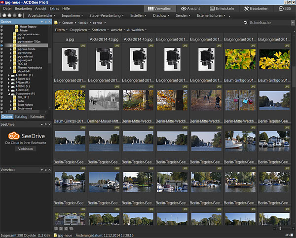 ACDSee Pro 8 erzeugt eine Datenbank über die auf dem Computer befindlichen Bilddateien. Sie kann rasch auf 1 GB und mehr anwachsen. Wer seine Systempartition nicht zumüllen möchte, gibt als erstes einen neuen Speicherort für die von ACDSee Pro 8 angelegte Datenbank ein.Dies ist über Datei - Datenbank möglich, indem dort eine neue Datenbank in einer anderen Partition angelegt wird. Nach dem Neustart des Programms wird unter Extra - Optionen - Datenbank geprüft, ob die neue Datenbank am gewünschten Ort existiert.