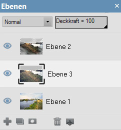 Beispiel: Ein Foto zeigt einen Deich am Fluss Oste. Der Himmel ist nahezu weiß, während die Schattenpartien sehr dunkel sind. Es wird ein Bild mit einem interessanteren Himmel geöffnet und darauf als neue Ebene das Foto vom Deich gelegt. Mit dem Radiergummi (Stärke 30 und weiche Kante) wird der Himmel des Deichfotos wegradiert, sodass der Himmel des darunterliegenden Fotos zum Vorschein kommt.
