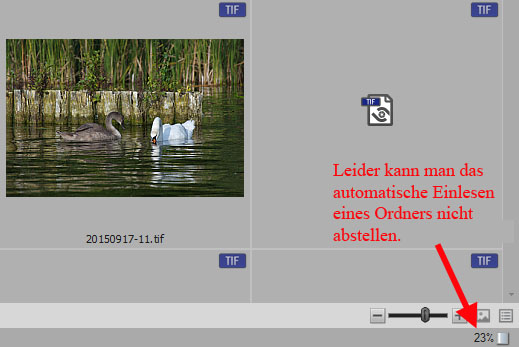 Wie schon bei einigen Vorversionen (Ultimate / Pro) greift ACDSee Ultimate 9 mitunter agressiv auf Festplatten zu. Zwar kann man eine generelle automatische Indizierung ausschalten, aber wenn man einen Bilderordner öffnet, liest ACDSee alle Bilder ein, auch wenn das 250 hochaufgelöste Tiffs sind oder noch mehr. Versucht man währenddessen eine große Bilddatei zu öffnen, können konventionelle Festplatten sirrende Geräusche von sich geben, die Sorge um den Zustand des Speichermediums auslösen. Wir schließen ACDSee in dem Fall sofort und starten das Programm neu. Ursächlich dafür ist das automatische Einlesen und Erstellen von Thumbnails für Bilddateien. Wir konnten nicht herausfinden, wie man dies deaktiviert.