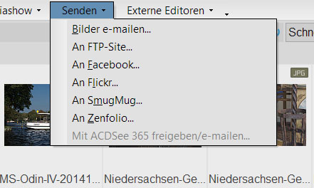 Das Internet spielt eine bedeutende Rolle in heutigen Bildverwaltungsprogrammen. Aus ACDSee Ultimate 9 kann man Bilder zu Facebook, Flickr, Zenfolio, SmugMug und einer FTP-Site senden. Man entscheidet hier, welche diese Schnittstellen installiert werden.