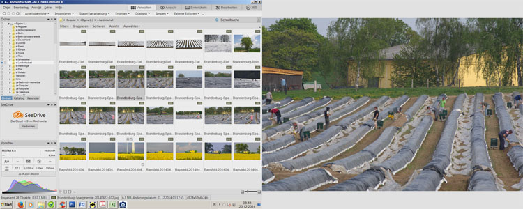 ACDSee Ultimate 9 ist ein multifunktionales Fotoprogramm mit folgenden Kernen: Bildbetrachtung, Bildbearbeitung, RAW-Konverter, IPTC / Metatexteditor, Websiteassistent und mehr.ACDSee im Verwaltungsmodus. Thumbnailübersicht in einem Album