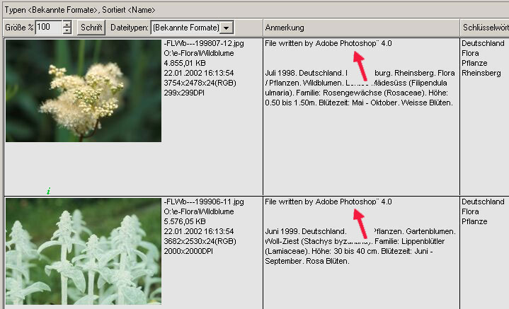 2012 @ Thomas GadeExifer ist ein nützliches Hilfsprogramm zum Beseitigen (und Einfügen) von Meta-Daten in Bilddateien. Das folgende Bild zeigt eine Ansicht aus Thumbs Plus. Dort erscheint im Feld Anmerkung der Hinweis 'File written bei Adobe Photoshop 4.0'. Dieser Eintrag ist unerwünscht und bringt dem Anwender gar nichts; im Gegenteil. Solche Einträge werden unkontrolliert von Programmen vorgenommen.