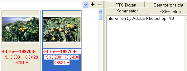 Exifer betrachtet vier Meta-Bereiche. IPTC-Daten, Kommentar, Benutzeransicht und EXIF-Daten. Der folgende Screenshot zeigt, dass Photoshop 4.0 sich im Bereich 'Kommentar' eingetragen hat.