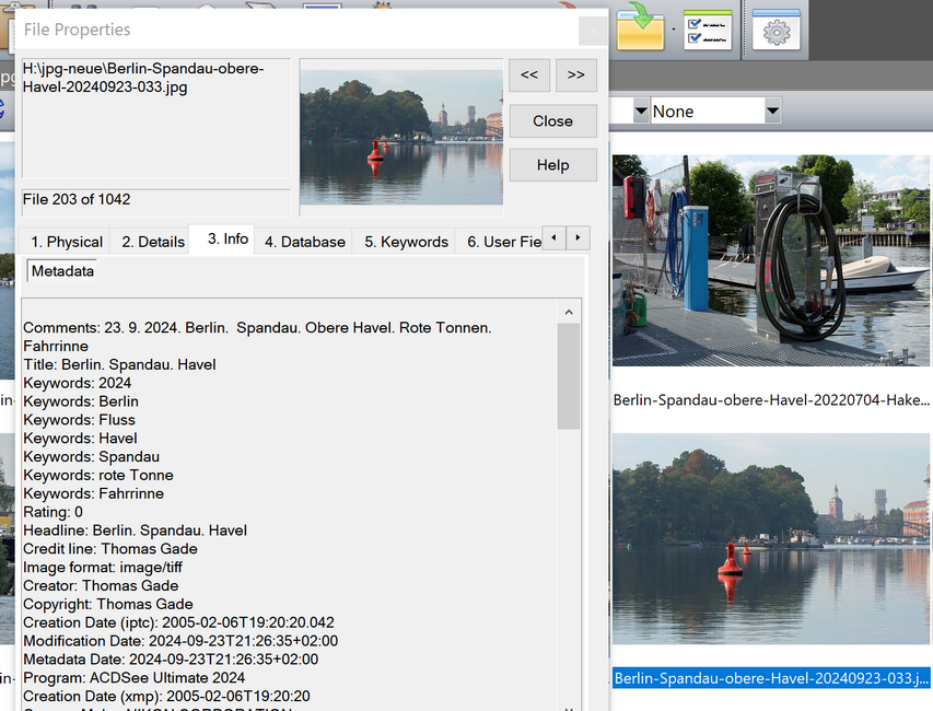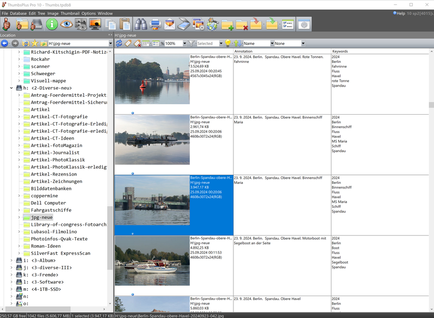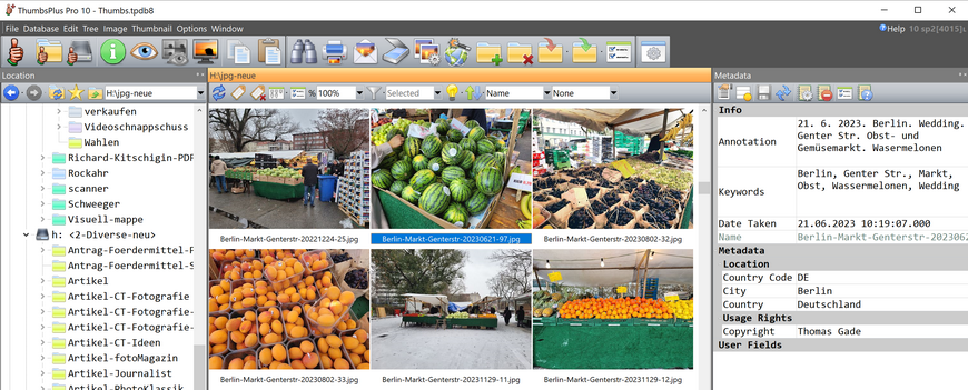 2024 © Thomas GadeThumbsPlus 10 ist ein sehr gutes und ausgereiftes Programm zur Bildverwaltung. In der linken Spalte kann man Speicher auf Computern und im Netzwerk durchsuchen, Ordnerinhalte öffnen und anzeigen, nach Dateien suchen, Dateien mit Schlüsselwörtern versehen, Dateien Galerien zuweisen, gefundene Listen anzeigen, Galerien anzeigen und Zip-Dateien als Ordner anzeigen. Im Hauptfenster sind die Bilder als Thumbnails (Miniaturansichten) oder als Listen zu sehen. Dienste, wie das Erstellen von Miniaturansichten, Stapelverarbeitung, Drucken von Bildverzeichnissen können vor hier ausgeführt werden.
