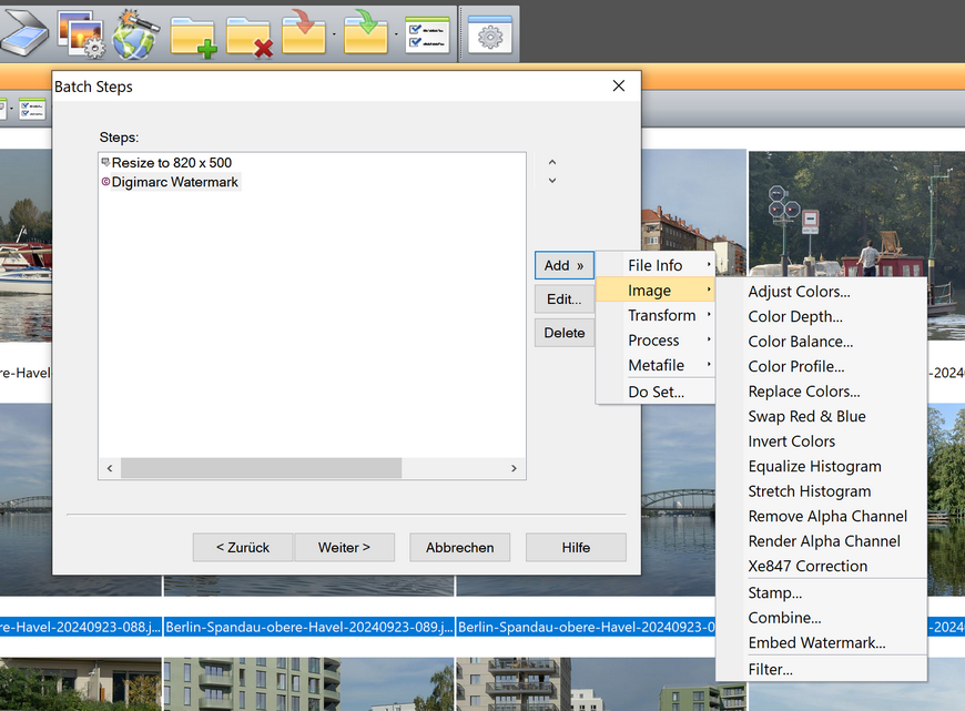 Mit der Stapelverarbeitung können mehrere Bilder gleichartig bearbeitet werden. Fast alle Bildbearbeitungsfunktionen sind für Stapelprozesse verfügbar. Sie können gespeichert und wieder aufgerufen werden. Mit der Stapelverarbeitung kann man aus jeder Ursprungsdatei sogar mehrere Ausgabedateien generieren.