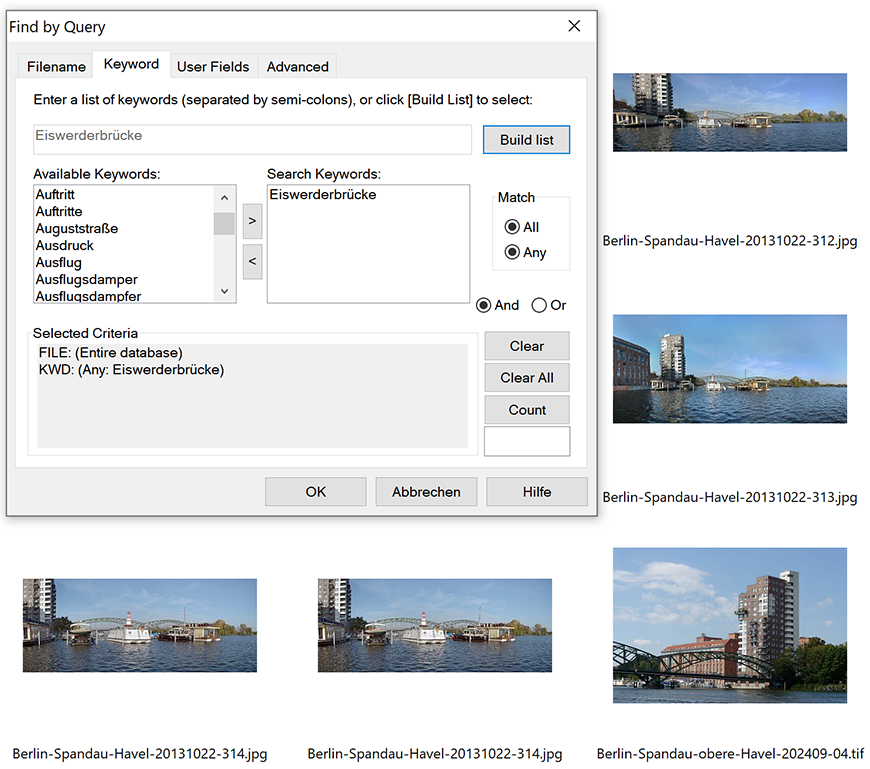Innerhalb einer Datenbank, können gleiche oder ähnliche Bilder identifiziert oder Fotos nach Suchbegriffen in den Metadaten gefunden werden. Die Datenbanken lassen sich in andere Formate exportieren.