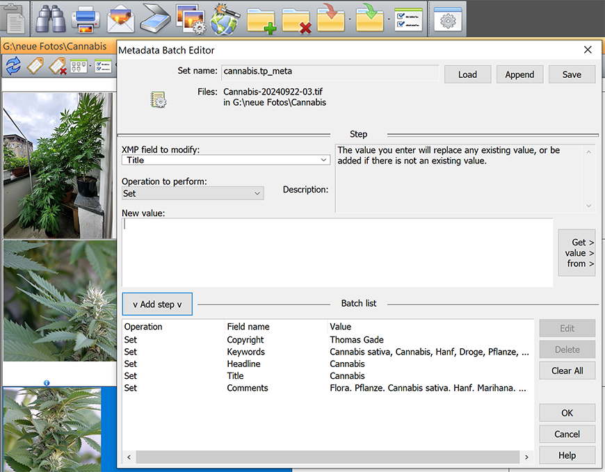 Mit dem Metadata Batch Editor kann man für viele Bilder grundsätzliche Beschriftungen vornehmen. Die Bedienung ist nicht intuitiv und es gibt keine einfache Anleitung. Dieses Werkzeug ist gut, um diverse IPTC- / Metadatensätze zu speichern, die immer wieder nützlich sind. Im dargestellten Beispiel geht es um Fotos von Cannabispflanzen. Der Fotograf hatte mehrfach die Gelegenheit, Hanfpflanzen zu fotografieren. Für alle Bilder treffen die Einträge zu. Diese Basiseinträge braucht man nur einmal zu speichern, um sie für weitere Bilderserien von den Motiven verwenden zu können.