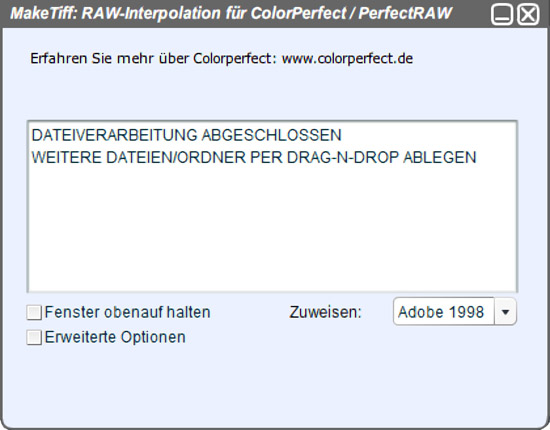 Die Anwendung ist simpel, aber lesen Sie trotzdem vorher die Erklärungen über MakeTiff auf der Website ColorPerfect.de. In der Praxis werden die RAW-Dateien in ein Verzeichnis auf den Computer kopiert. Anschließend startet man MakeTiff und schiebt die RAW-Dateien per Drag and Drop in das MakeTiff-Fenster. Daraufhin erstellt es im Ursprungsordner .tiff Dateien. Bei Bedarf kann man die Dateiendung mit einem Dateimanager, wie TotalCommander, zu .tif umbenennen.