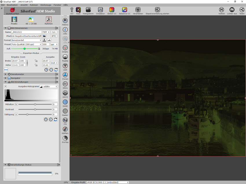 Die Werkzeuge von SilverFast HDR können genutzt werden, um negative Dateien mit natürlich wirkenden Farben zu invertieren. Allerdings kann SilverFast HDR keine RAW-Dateien interpretieren. Diese müssen zuvor zu TIF-Dateien umgewandelt werden. Prinzipiell kann man das mit dem RAW-Konverter machen, aber bessere Farben erzielt man durch lineare Tiffs.