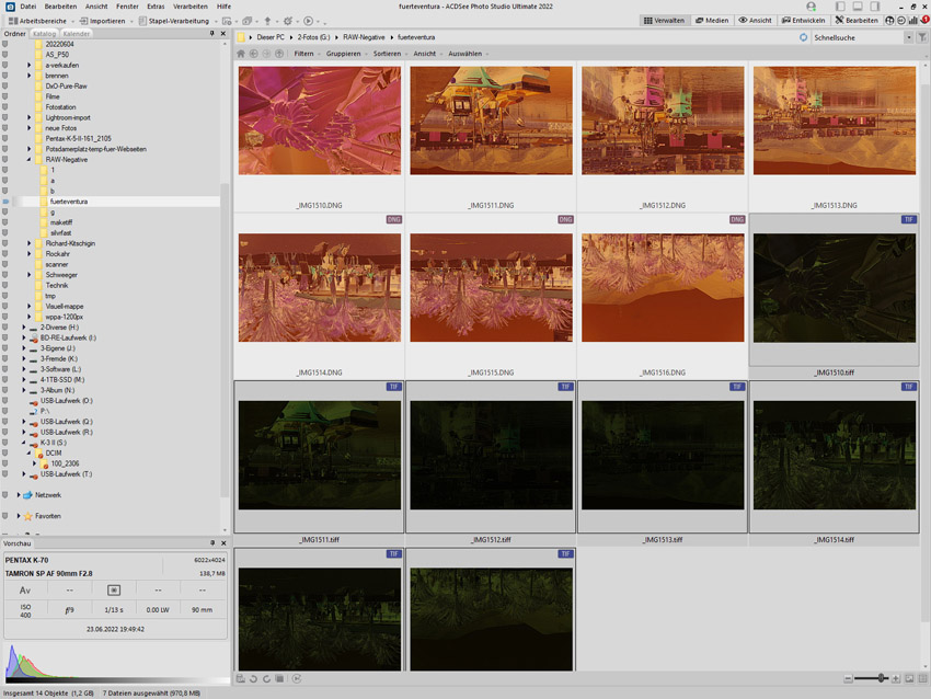 Herauskommen sollen Bilder, die sehr dunkel und grünlich wirken. Ihre Dateiendung lautet .tiff. Bei Dateien aus einer Pentax K-3 II und der Pentax K-70 klappt das sehr gut. Die Dateien aus meiner Pentax K-5 II werden jedoch monochrom konvertiert. Vermutlich lässt sich das beheben, aber da ich die anderen Kameras benutze, bemühte ich mich nicht um eine Klärung.