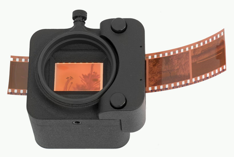 Basismodul vom Valoi easy35 mit Halter für ein gerahmtes Dia, das von hinten durch eine eingebaute LED-Leuchte beleuchtet wird. Das Gehäuse ist im 3-D-Druck hergestellt.