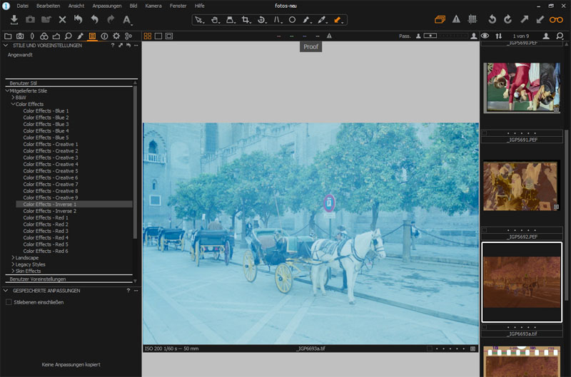 Das Arbeiten mit Styles & Voreinstellungen ist sehr nützlich beim Digitalisieren von Negativen mit der Digitalkamera. Capture One enthält zwei Einstellungen zur Tonwertumkehrung: Styles integrieren -> Color Effect -> Color Effects - Inverse (1 und 2)Nach der Tonwertumkehrung passt man den Weißabgleich an. Anschließend speichert man alle Einstellungen als Benutzer-Style mit einem erklärenden Namen, beispielsweise: colornegativ-1. Meist kann man diese Einstellung für andere Fotos aus derselben Serie auf dem gleichen Film erfolgreich anwenden.