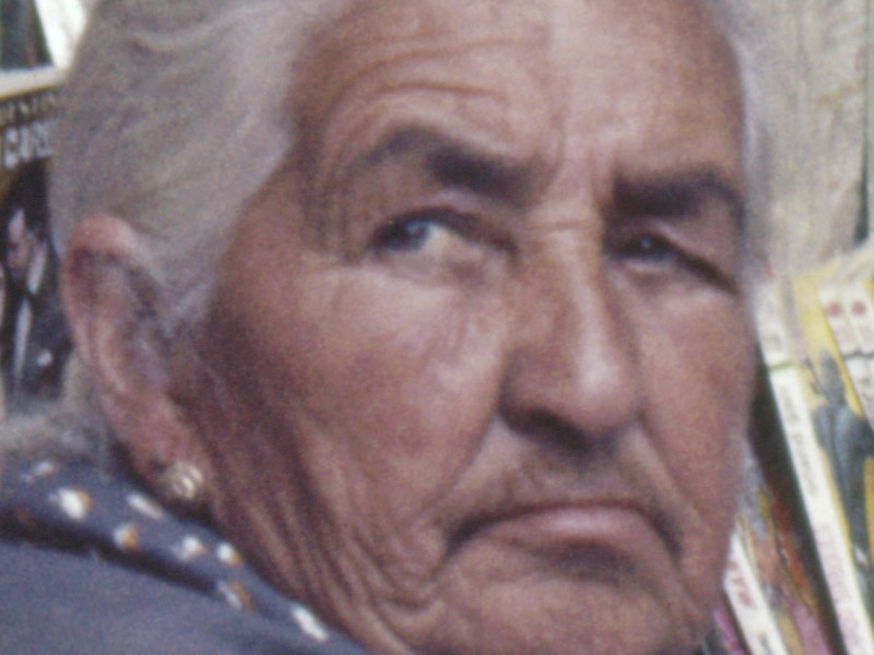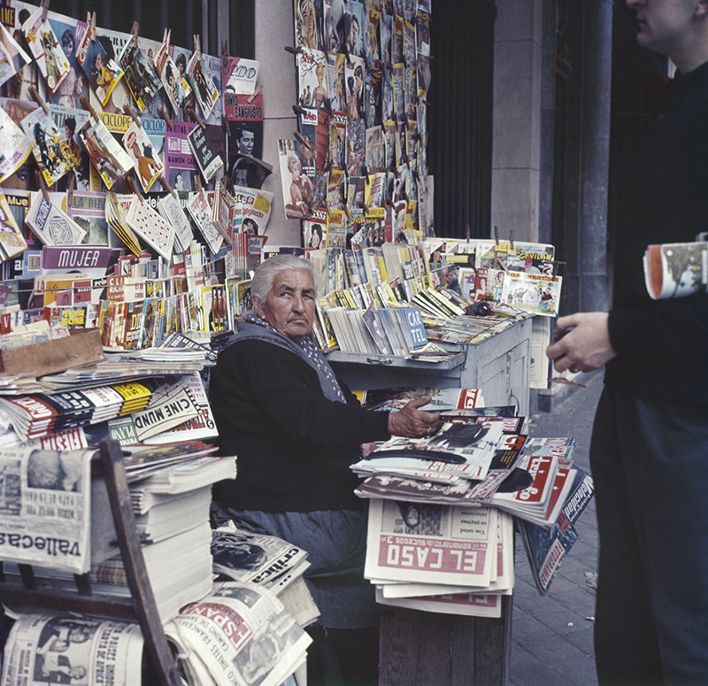 1964. Zeitungsverkäuferin in Portugal. 6x6 Diapositiv. Freihändig fotografiert mit einer zweiäugigen Rolleiflex. Die Abbildungsqualität ist ordentlich und entspricht etwa dem, was man von der damaligen Technik erwarten konnte.