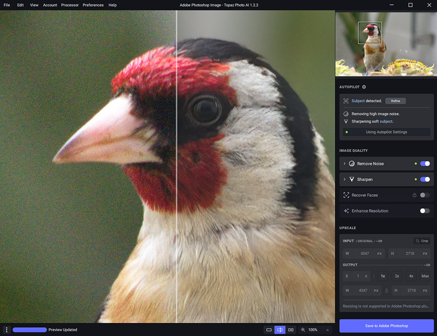 Ausschnitt vom Kopf des Stieglitz aus dem Foto. Verbessert mit Topaz Photo Ai 2. Die effektive Rauschreduzierung und erheblich verbesserte Detailzeichnung sind verblüffend. Man fragt sich, wie weit diese technologische Entwicklung auf die Spitze getrieben werden kann und wie solche Optimierungen zustande kommen. Werden Mikrodetails hinzu erfunden, oder lassen Sie sich tatsächlich durch fortschrittlichere Interpretationen der Dateien herausarbeiten?