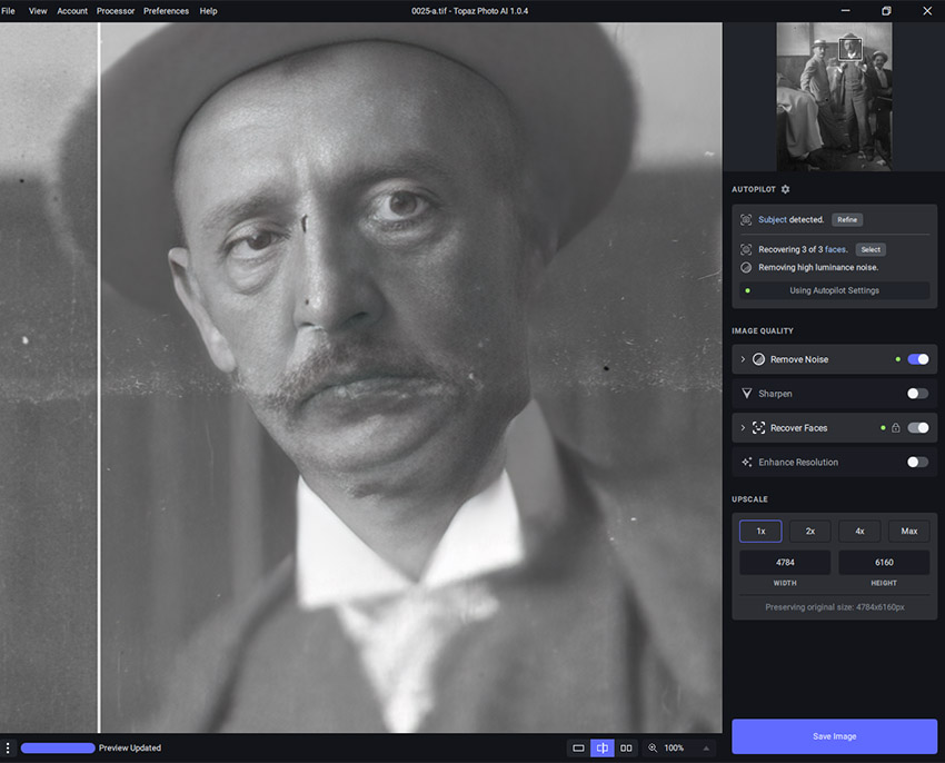 Topaz Photo Ai 1.0.4. Ausschnitt mit Gesicht eines Mannes nach der Bearbeitung. Woher stammen die Details?