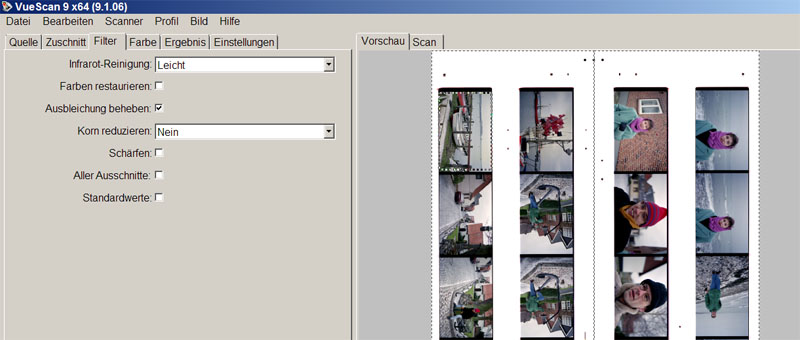 Beim Scannen von konventionellen Schwarzweißfilmen muss die Infratrot-Reinigung auf 'Nein' stehen. Die Einstellung