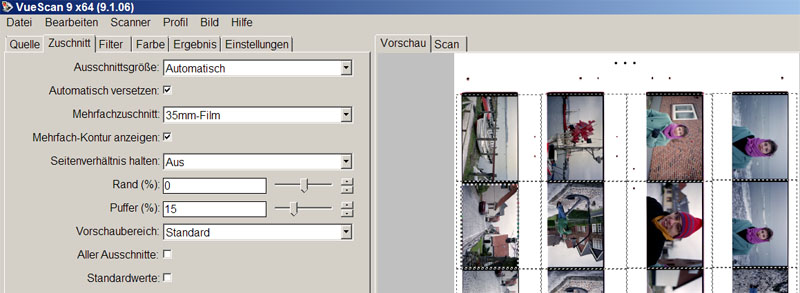 Unter 'Zuschnitt' wird bei 'Ausschnittsgröße' Automatisch eingestellt, bei '35mm-Film' und bei 'Puffer (%)' 15.