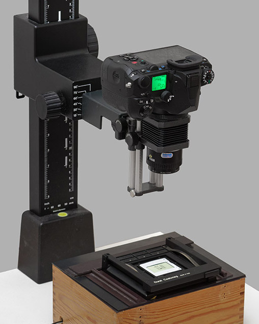 Sehr bewährt hat sich als Optik ein Rodenstock Apo Rodagon D 75mm am Balgengerät von Novoflex. Das Objektiv wurde speziell für die nötigen Abbildungsmaßstäbe konstruiert. Das Balgengerät ermöglicht eine präzise Fokussierung. Die gesamte Kombination wird über ein Fotogewinde am Balgengerät an die Reprosäule geschraubt, was Verschleiss am Stativgewinde des Kameragehäuses vermeidet. Mit Adaptern können Gehäuse auch verschiedenen Systemen an das Balgengerät montiert werden.