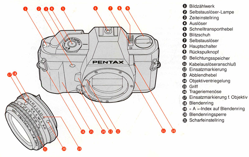 In der Bedienungsanleitung werden die relevanten Bestandteile des Kamerakörpers und eines Objektivs genau benannt. Es ist sinnvoll, die Darstellungen und Begriffe zu beachten, um einen Überblick über die bedienbaren Teile zu erhalten. Was ist was und wie heißt es, ist zum Verstehen der Bedienungsanleitung wichtig. In jeder Zeit können Leute mit Erfahrungen mit gegenwärtiger Technik vieles intuitiv bedienen, aber die analoge Fotografie wird nur von wenigen praktiziert und kaum noch über ältere Familienangehörige vermittelt.