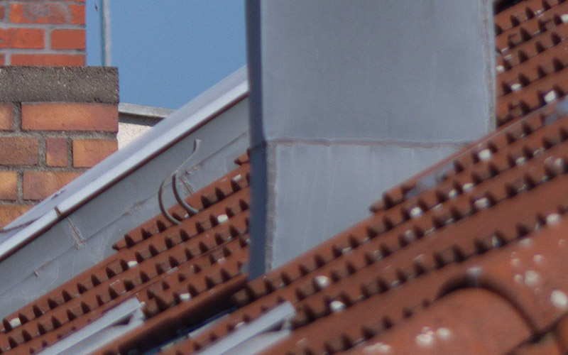 Vergleich mit dem smc PENTAX-DA 55-300mm f 4.-5.8 EDAls Testmotiv diente eine alte Fernsehantenne auf einem Hausdach. Um etwa 10:20 Uhr an einem warmen Tag im August flimmerte die Luft leicht, was beim Vergleich von feinsten Details zu berücksichtigen ist. Besonders am Kanten von Mauern.