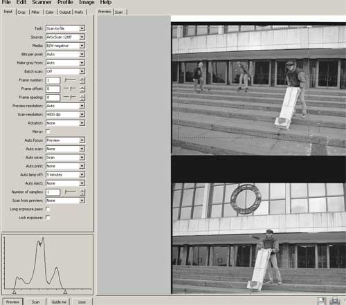 Unter 'Input' wird bei 'Batch scan' 'List' gewählt. Hat der Filmstreifen drei Bilder und alle sollen gescannt werden, trägt man bei 'Batch list' 1,2,3 ein. Hier werden Kommata gesetzt! Klickt man nun auf 'Preview' wird von jedem Bild eine Vorschau erstellt. Ist das erledigt, wechselt man mit dem Schieber neben 'Frame number' zwischen den Bildern hin und her. Sie werden ziemlich groß dargestellt. Am Histogramm lassen sich die Weiss- und Schwarzpunkte individuell setzen, falls man unter 'Color' keine allgemeine Vorgabe gemacht hat. Die Scanrahmen können individuell nachjustiert werden. Da die Abstände zwischen den Bildern variieren, ist das eventuell nötig. Bei 'Auto focus' steht immer 'Always'.