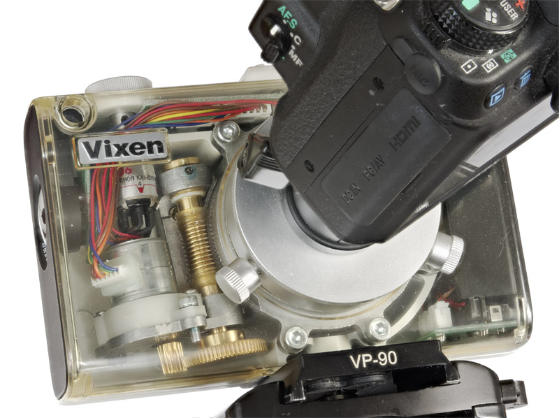 Vixen Polarie Star Tracker auf einem Fotostativ mit einer Pentax DSLR. Ein gutes Fotostativ reicht aus. Der Kopf sollte die Last des Aufbaus gut tragen. Der SRIUI VH-10 schafft das, besser ist aber der Neigekopf.